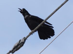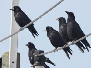 今シーズンも巨椋池干拓地でミヤマガラス(カラス科)に会えました!10羽ほどいました。電線に留まっていました。のんびりしているように見えました。