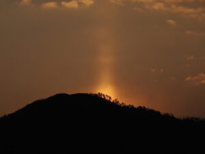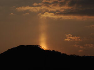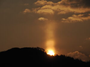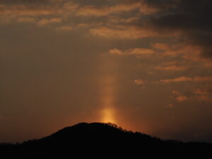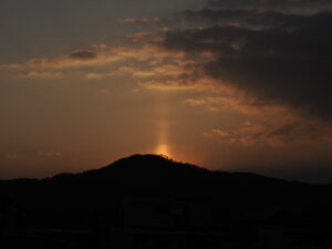今朝、自宅の窓から「太陽柱(たいようちゅう)」が見られました。送り火で有名な大文字山から昇る太陽から真っすぐ上に伸びる太陽柱は幻想的でした。太陽が山からすっかり顔を出した瞬間、太陽柱も消えました。10分くらいの自然のショータイムでした!