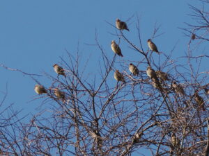 今日、京都府立植物園で、ヒレンジャク(レンジャク科)の群れに出会いました!数は数えていませんがざっとの感じで、50、60羽はいたように思いました。
