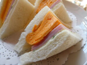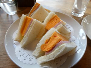 A propos du Sandwich à l’omelette, c’est un plat que l’on peut manger dans certains cafés à Kyoto. Je pense que c’est vraiment japonais. Car l’omelette utilisée pour ce sandwich est assisonnée de dashi (bouillon japonais fait à base de poisson sec ou d’algue) . En plus c’est un peu sucré par du sucre. Ce plat, c’est une spécialité pour le petit déjeuners à Kyoto, je pense.